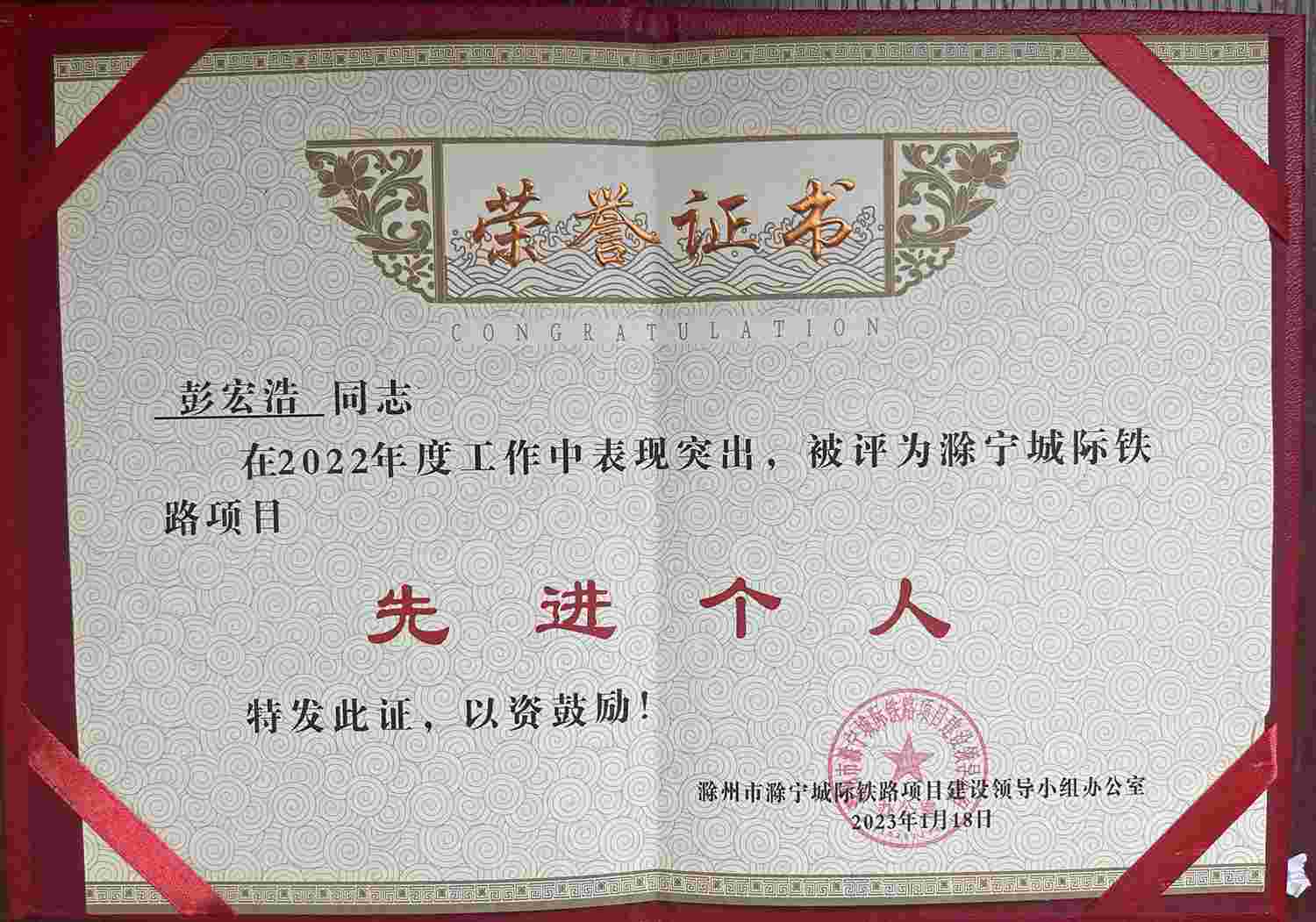 在项目建设过程中,团队依托公司在轨道交通建设和运营领域丰富的建设经验,克服了疫情形势严峻、工期紧张,协调单位多,质量要求高,任务重等一系列困难,不断优化项目管理和过程管控,保障了滁宁城际顺利开通。由于表现突出,项目经理彭宏浩被滁宁城际铁路项目建设领导小组办公室评为“先进个人”。