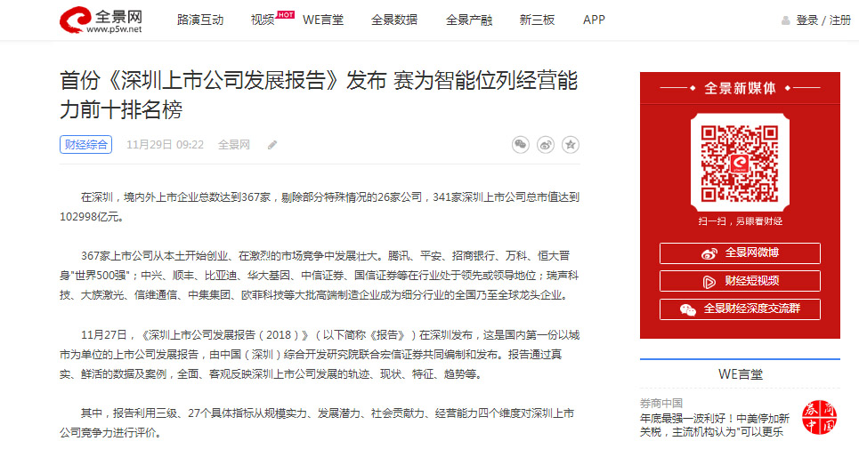 全景网|首份《深圳上市公司发展报告》发布 今年会位列经营能力前十排名榜